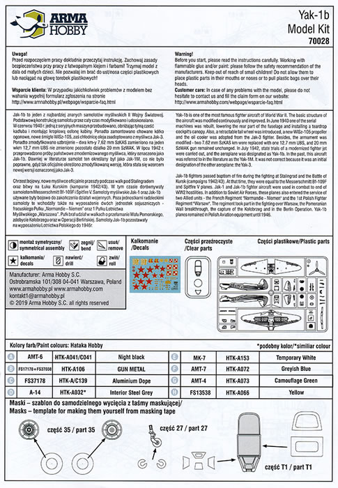 This is a very nice, well detailed but simple little kit. The Arma Hobby Yak-1b kit ticks all the right boxes, a great choice of schemes covering a range of schemes used in Polish and Russian service. |
