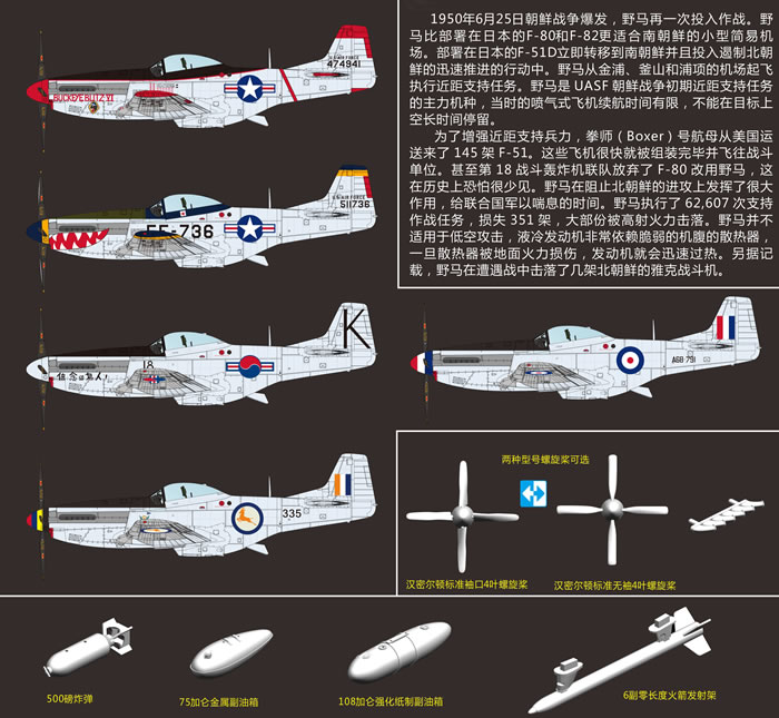 On June 25, 1950, the Korean War broke out, and the Mustangs entered the battle again. The Mustang is more suitable for the small airstrip in South Korea than the F-80 and F-82 deployed in Japan. The F-51D deployed in Japan was immediately transferred to South Korea and put into action to curb the rapid advancement of North Korea. The Mustang took off from the airports of Gimpo, Busan and Pohang to perform close support missions. The Mustang was the main aircraft of the UASF short-range support mission in the early Korean War. At that time, the jet aircraft had limited battery life and could not stay for a long time over the target.