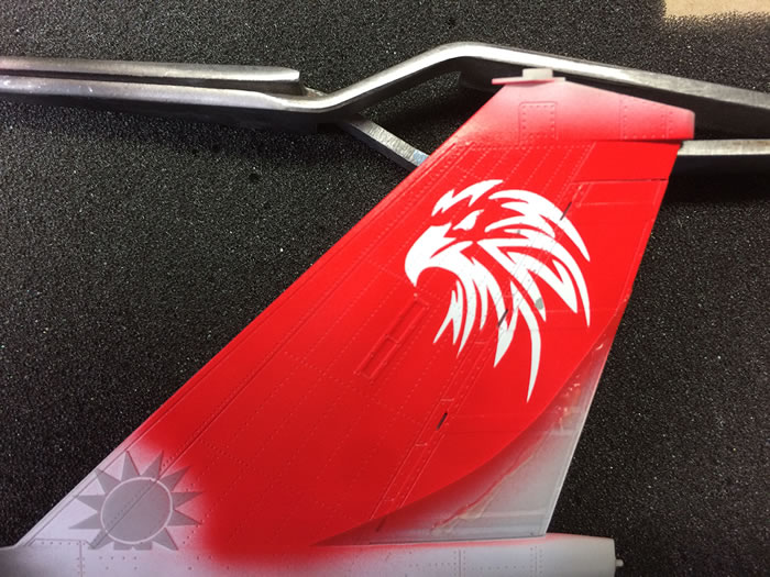 The first stage is to scan the decal sheet and trace the eagle outline using Inkscape. I then cut this out using a Silhouette Portrait 2 cutter. My settings are depth 2, force 2, speed 1 with 1 pass and an overcut of 0.01mm. This is for cutting into Artool Ultramask, which is a vinyl film that comes in a roll. Once cut (and I make several to allow for mistakes), the eagle head design is laid over the tail, which had been airbrushed with Mr Finishing Surfacer 1500 White. Doing that is the really tricky bit. I repeated this for the white and blue flash at the base of the rudder, and the star design at the base of the front of the fin.