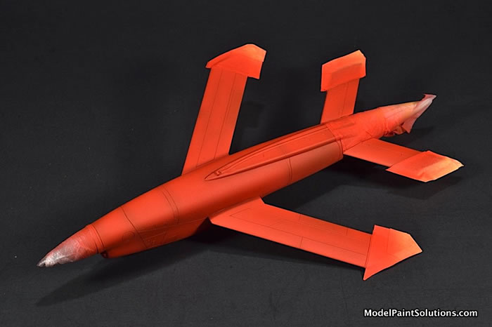 When this was dry, the model was lightly buffed with a dry Kimwipe resulting in a smoother, shinier finish. The nose cone was then shot AK Black 6RP diluted to ~30% paint with AK High Compatibility Thinner (HCT). That’s a ratio of paint to thinner of 30:70. The HCT had both Liquitex Flow-Aid and Liquitex Slow-Dry each added to 5% by volume ahead of time. This is my standard mix for most/all acrylic thinners.