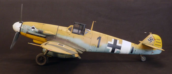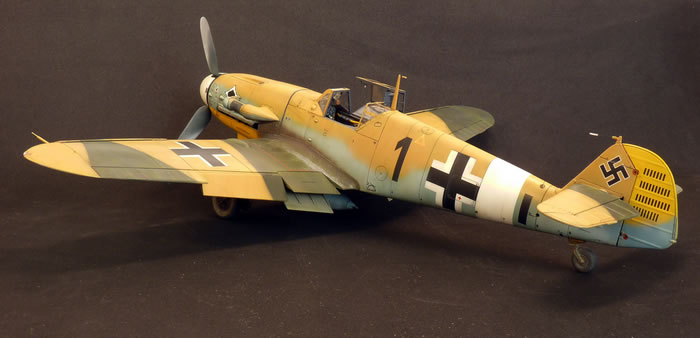 This the Hasegawa Messerschmitt Bf 109 G-6 in 1/32 scale, reboxed in 2002 by Monogram Pro Modeler with extra parts to depict a G-4 Trop variant: spoked wheels, dust filter, etc. I chose the well known "schwarze 1", the personal mount of Oblt. Fraz "Nawratil" Schiess while he was operating in the skies of Tunisia and Sicily.