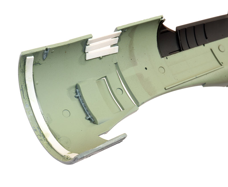 I also inserted and glued the exhaust stacks from the inside of the fuselage halves before the fuselage was joined. Finally, I glued a strip of plastic on the inside of the starboard fuselage half as a locating aid for the front engine plug (thanks to Andreas Beck for some handy hints).