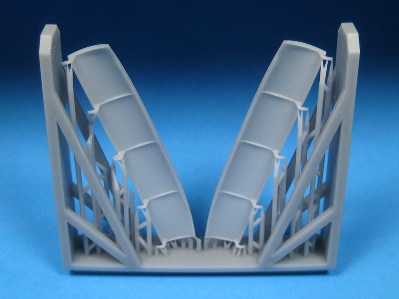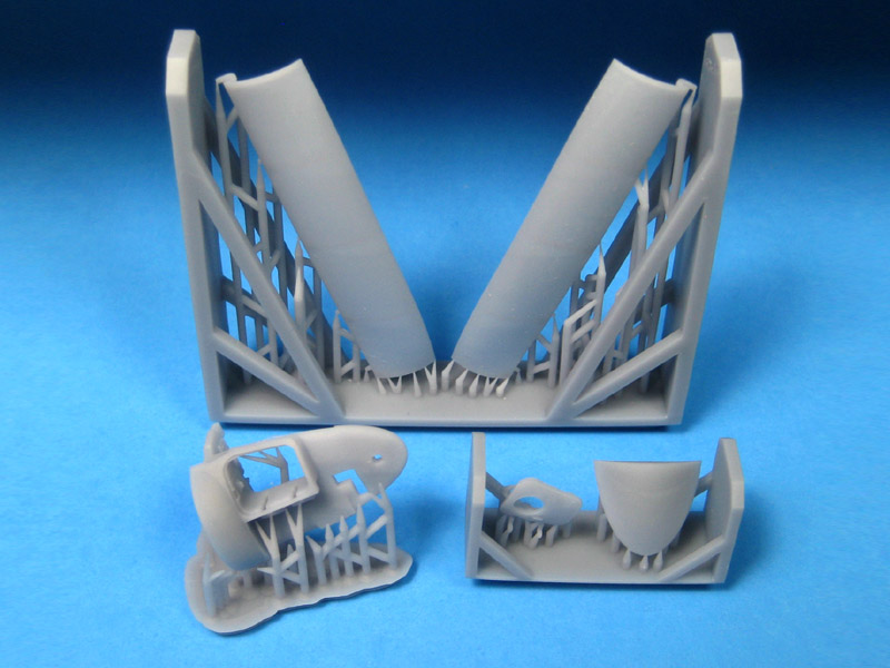 The Airfix 1/72 Mosquito B Mk XVI (bomber variant) is a very accurate kit, with the exception of the bulged bomb bay. The bomb doors and rear fairing are actually for a target tug. It's a good amount of work for the modeller to correct this. This set contains an accurate, bulged bomb bay, with front and rear fairings, open bay doors, and a separate, open entry hatch. The bomb doors have detail inside and out and have accurate u-shaped hinges. Designed for the Airfix B Mk XVI. CAD by Mike O'Hare.