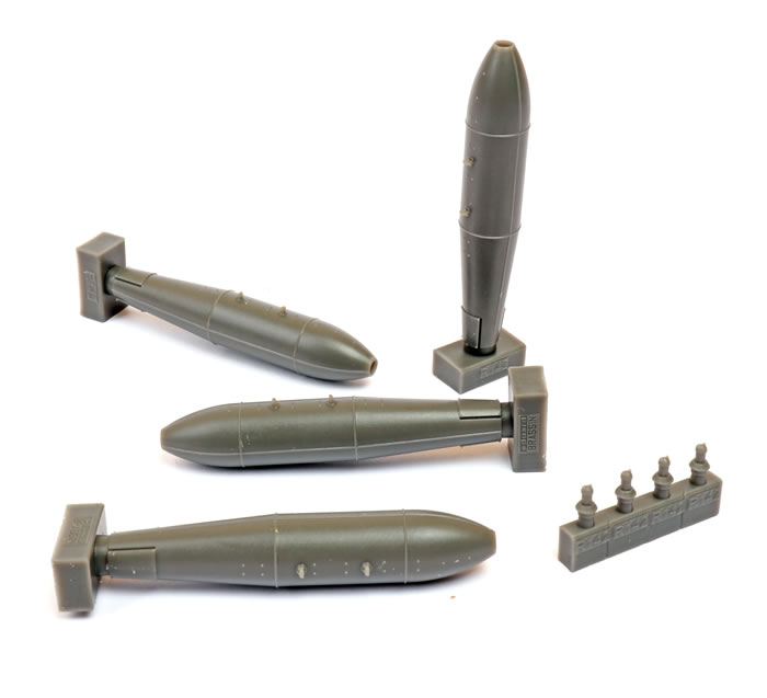 The photo-etched parts are the fins and the tail cap for the four dispensers. The resin bodies are cast with a positive recessed locating slot for the photo-etched fins.
