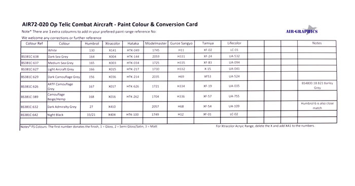 The full colour instructions give very clear location diagrams for the individual markings and a couple of generic drawings show stencil and generic mark locations. Also useful is a card containing paint colour matches for Humbrol, Xtracolour, Hataka, ModelMaster, Gunze Sanyo, Tamiya and Lifecolor. Interspersed through the booklet are a small number of colour images of the subjects.