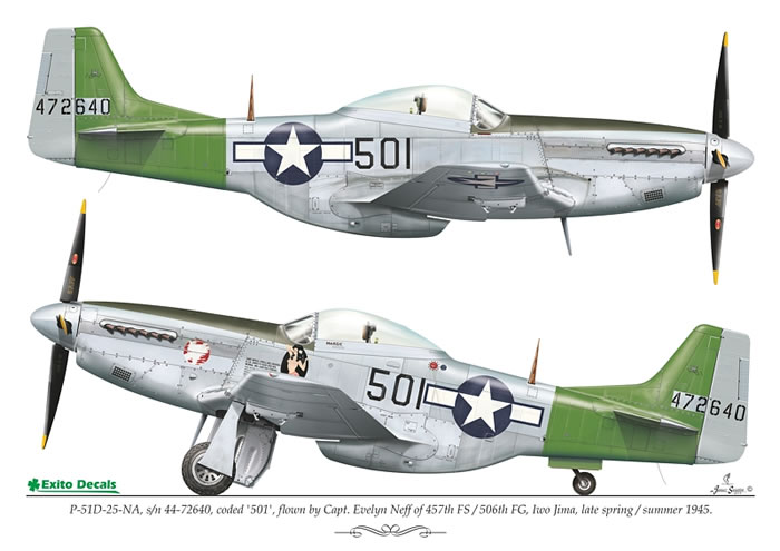 P-51D-25-NA, s/n 44-72640, coded ‘501’, flown by Capt. Evelyn Neff of 457th FS / 506th FG, Iwo Jima, late spring / summer 1945.]