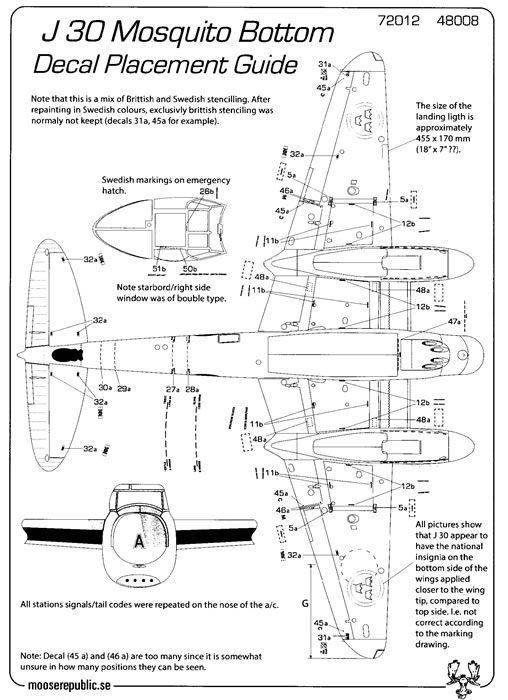 The set came with three sheets of decals, one containing the roundels and ten of the large aircraft letters with the second consisting of fifty plus English and Swedish aircraft stencils while the third smaller sheet holds corrections for the night fighter logo on the crew access door.