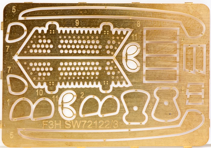 The photo-etched fret provides such items as the ejection seat handle, eight wing fences, air brakes and a few panels and the moveable tailplane plates, and are well etched.