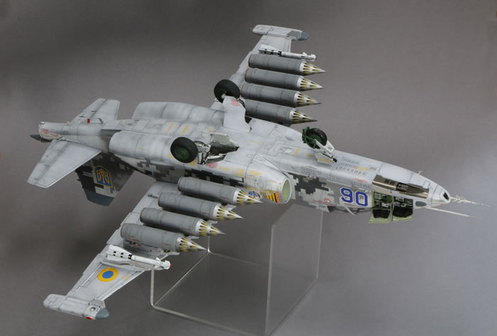 These are both the well-known 1/32 Trumpeter kits. Each has been improved a lot with a vast array of after-market items, which these fairly old kits really needed. The Ukrainian aircraft with the ‘digital’ camouflage utilises excellent masks and decals made by the Ukrainian company Foxbot, which I’m told are currently out of production. The Russian aircraft has an invented ‘bort number’ made from my decal spares, but it seems plausible according to the research I’ve done. The rocket launchers and cluster bombs are particularly good in quality and they’re made by Reskit.