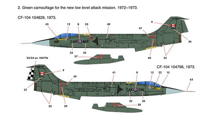 Canadian Air Force (CAF) CF-104 serial number 104796 or 104829 1972-1973 in all over green FS34226. The aircraft has high visibility markings and black and white check rudder.