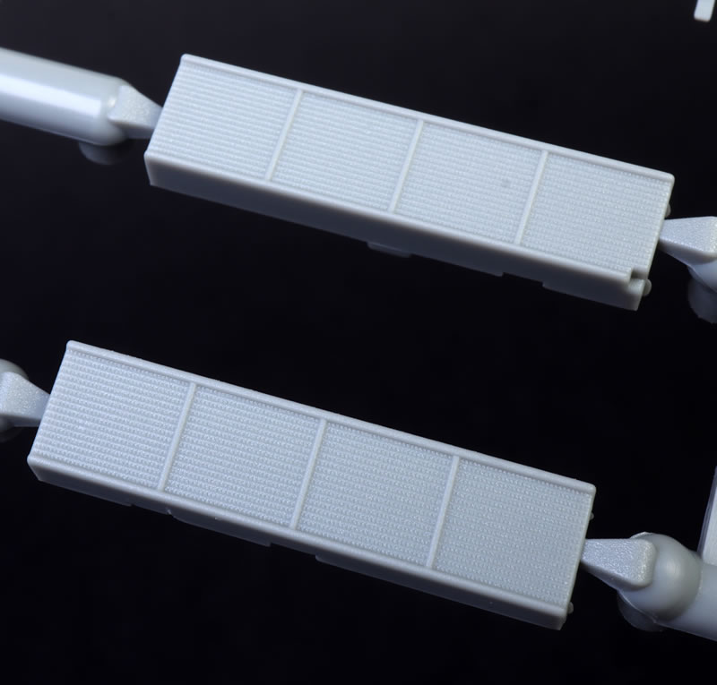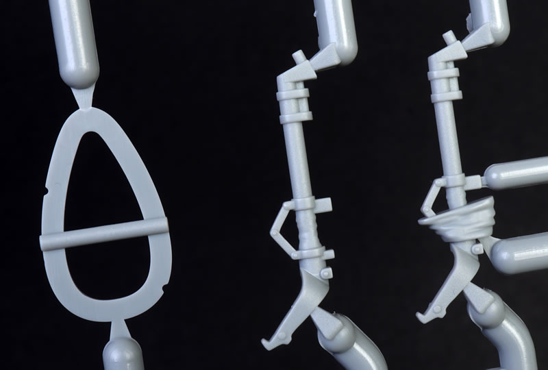 Plastic has a slightly pebbly texture; some ejector pin circles in visible places (e.g. inside of the open engine cowlings); some won't like the breakdown and skeletal framework. |