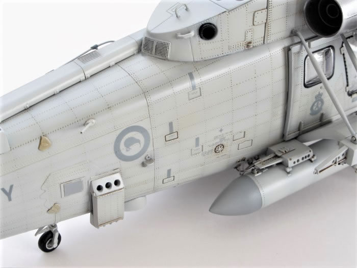 The kit contains markings for one of the five SH-2G(NZ) aircraft operated by New Zealand between 2001 and 2016. In order to make it more closely resemble a NZ machine, I added some extra details not included in the kit. This was mainly the radar equipment in the rear cabin, the bench seat, a beefed up cargo hook, winch, additions to the weapons pylon structure, HF aerial tubing on the port side (Albion Alloys Brass tubing was used for this) and a deck lock mechanism.