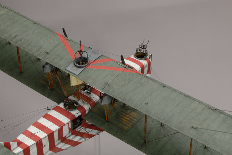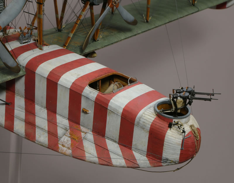 There was a little ladder that connected to the fuselage. I've presumed that the plywood walkway that runs over the top of the fuselage would have been extended forward on the port side to avoid the danger of the crew damaging the stretched canvas area that's normally between the walkway and the open hatch. I created all the markings using masks, including the serial number on the tail, and also added some red stripes on the top wing which are barely visible on the original photographs and which were, presumably, to remind the top gunner not to shoot through his own propellers, which would have been rather inconvenient.