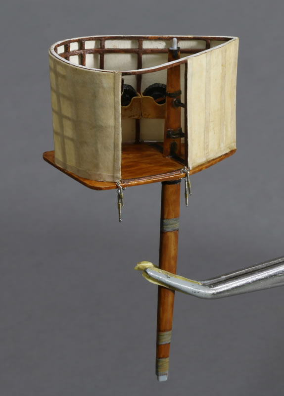 In the last year of the war there seems to have been two standard sizes of Scarff ring; a small one for a single Lewis gun and a larger one that could take one or two guns. The top Scarff ring here on N4543 seems to be a hybrid type that I haven’t seen anywhere else; the ring itself is the bigger size but the bungee cord arrangement being of the type seen on the smaller ring. I had to adapt the kit parts to create this and this work included turning two tiny brass rollers on my lathe.