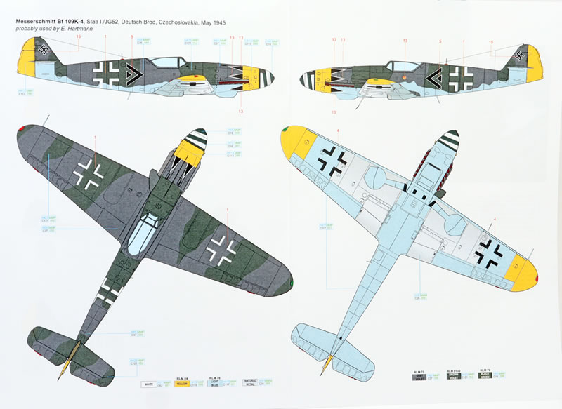 - Messerschmitt Bf 109 K-4, Stab I./JG52, Deutsch Brod, Czechoslovakia, May 1945, probably used by E. Hartmann. Chevron and tulip leaves with white spiral on a black spinner, and yellow band partially overpainting the tulip leaves and yellow overpainted rudder. Instructions suggest upper surface colours are RLM 75 and RLM 81, but really your guess is as good as mine (especially the RLM 81 suggestion). Decal for the spinner spiral is not supplied.