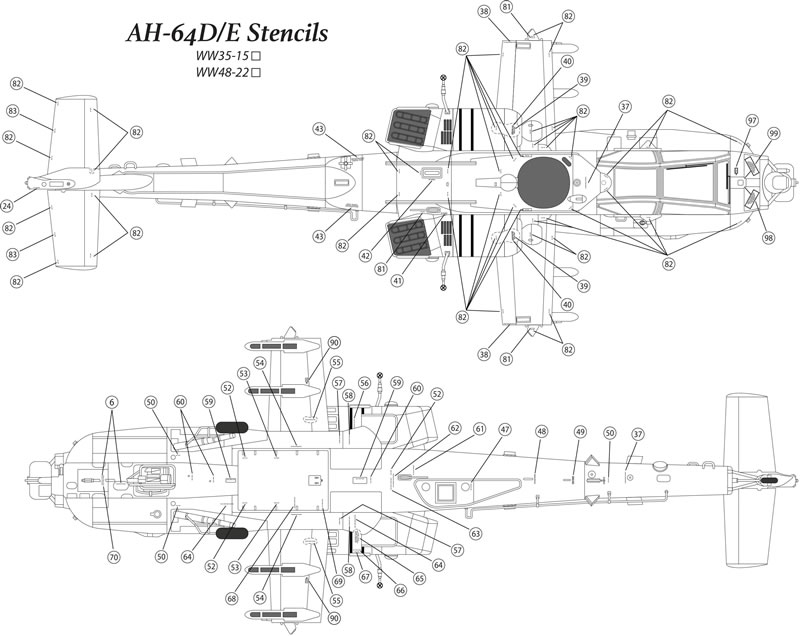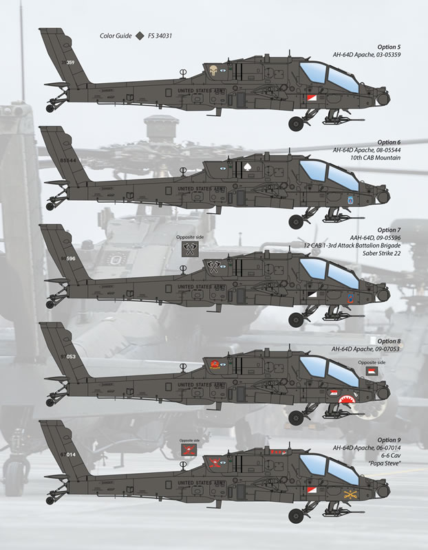 Markings for 22 Apaches of various Delta and Echo models and includes stencils for one aircraft.