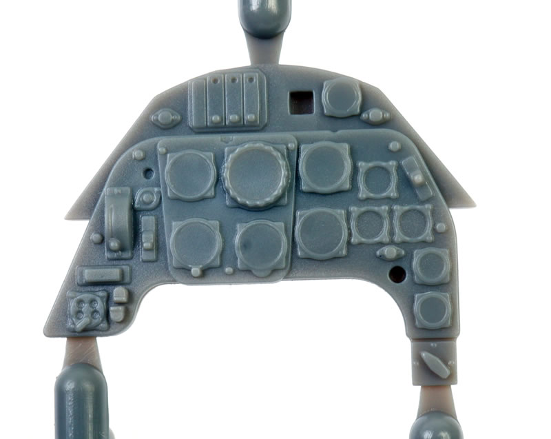 Two styles of instrument panel are supplied – Early and Late. They both have raised bezels and switches with flat circles representing lenses. Individual decals are offered for instrument dials and ammo counters.