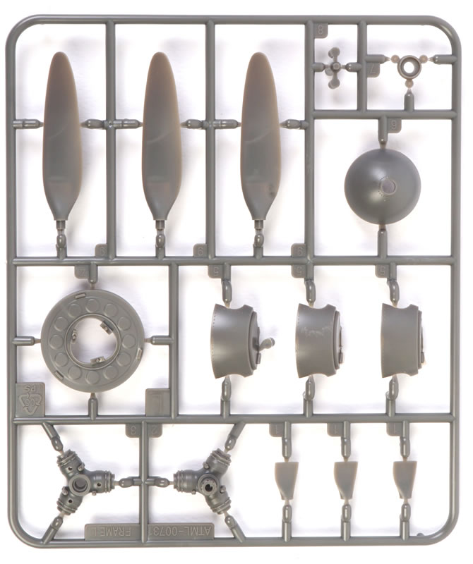 The propeller assembly is a surprisingly busy sub-set of 14 parts, including separate inserts behind each blade root.
