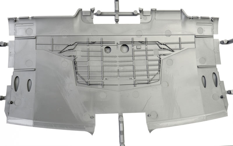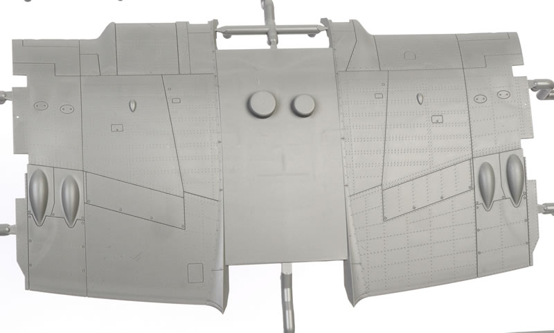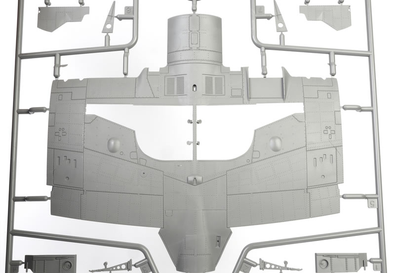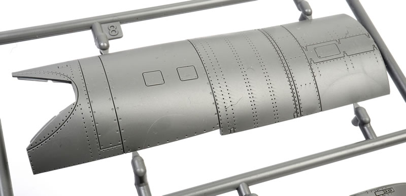 The fuselage is broken down conventionally into two full-length halves, with a long upper cowl moulded as a separate single-piece insert.