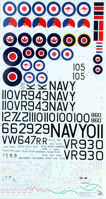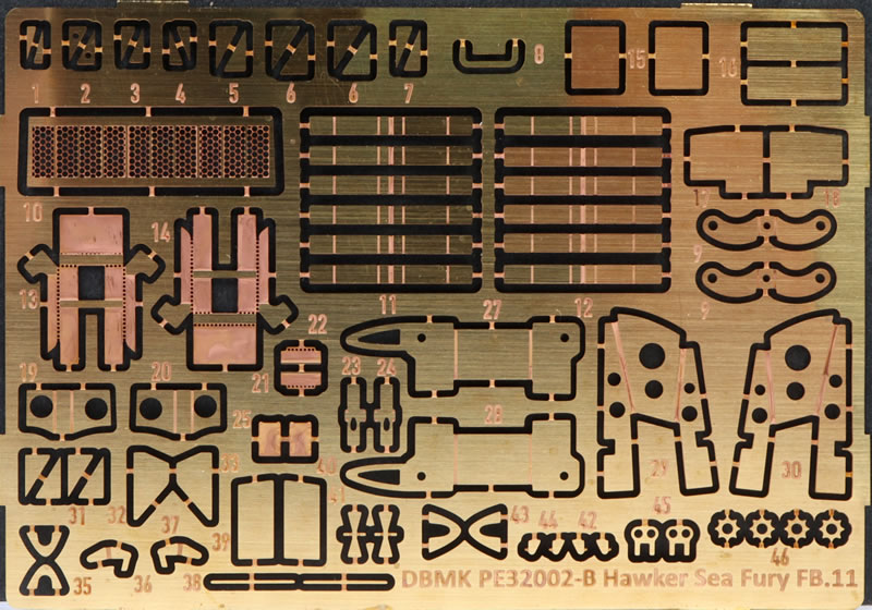 DBMK’s 1/32 scale Sea Fury FB.11 comprises 338 grey plastic parts on eleven sprues, 117 photo-etched parts on one colour and one brass fret, and seven marking options on a large, glossy Cartograf decal sheet. Instructions and box art are still in development.