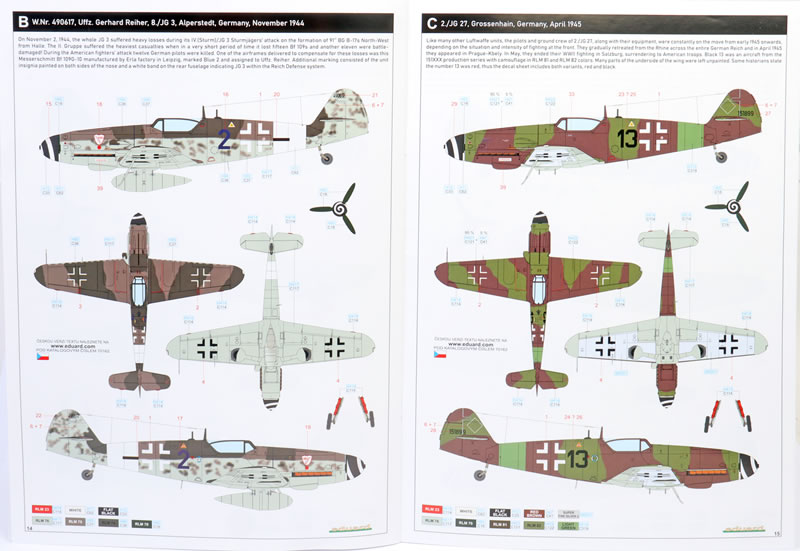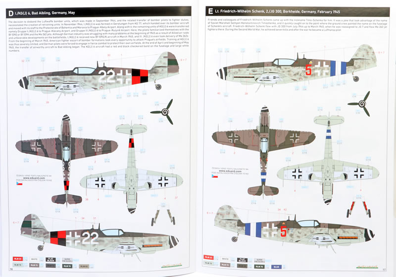 Decals are provided for six examples and each is given a full-colour, four-view set of drawings and a useful set of historical notes. The decals are beautifully printed with great depth, register and minimal carrier film on a mid-blue backing sheet. Swastikas are in the familiar broken format.
