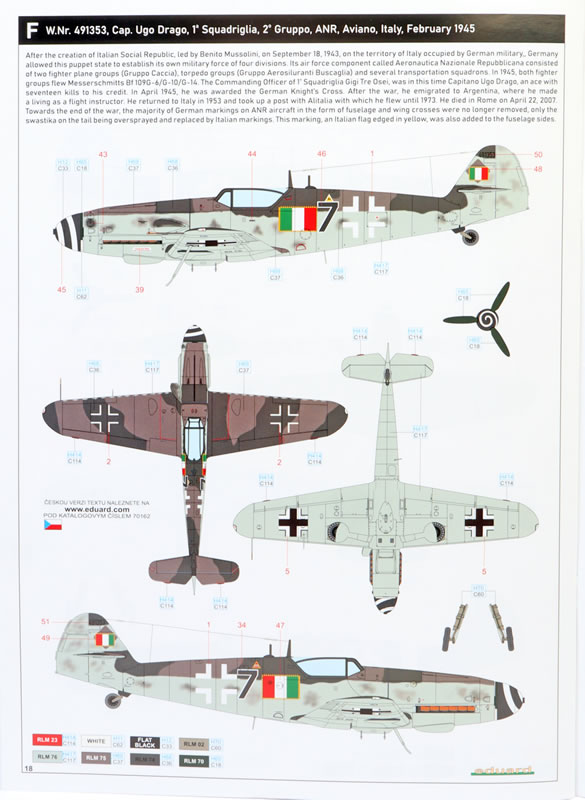 Most of the smaller sprue is not used so appears to be from the earlier series kit. A twenty-page all colour A4 instruction booklet covers the construction in ten pages with colours called out in each one. The first page has a potted history of this famous aeroplane from birth to the post war. A sprue map indicates that 74 parts will go into your spares box. Paints are only for Gunze Aqueous and Mr. Color ranges. Being a ProfiPACK kit there are also a mass of decal choices, a set of masks and two PE frets, one in colour.