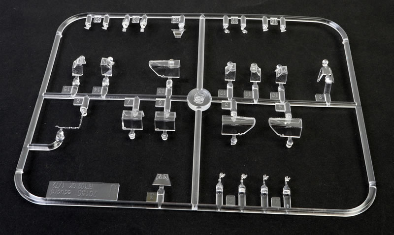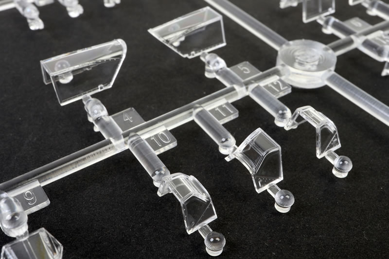 Inside the box are two large dark grey sprues and one smaller one in a resealable clear sleeve and a smaller one with transparencies.