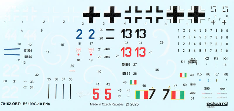 In the usual large sturdy top-opening box the lid is decorated with a great image of a pair of “Erlas” lurking over a flight of B-17s, including White 44 one of the decal choices.