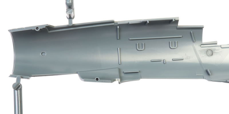 This kit features recessed surface textures and a modest parts count. Shape issues persist around the nose and spine, and the cockpit is fairly basic, but fit is good according to those who have built it. The included weapons and decals are usable.