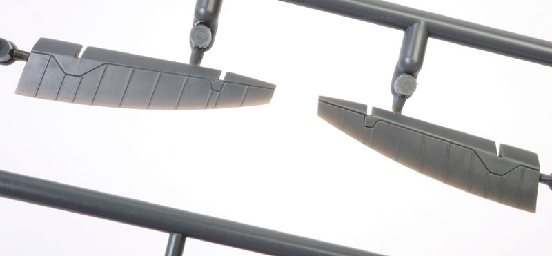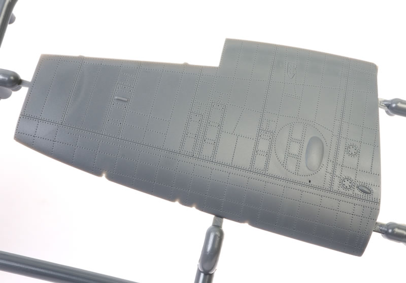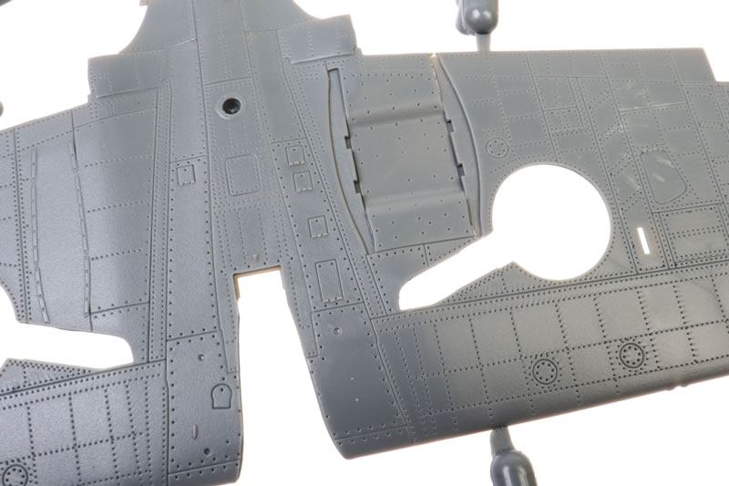 The upper wings feature the kidney shaped bulges to accomodate the main wheels. Machine gun access panels are moulded shut.
