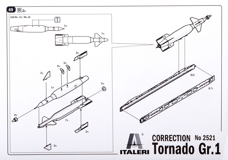 Italeri has added two new identical plastic sprues (Sprue N) that contain two 1,000 lb bombs. Other early-production GR.1 characteristics are either already on the sprues or will require some minor surgery.