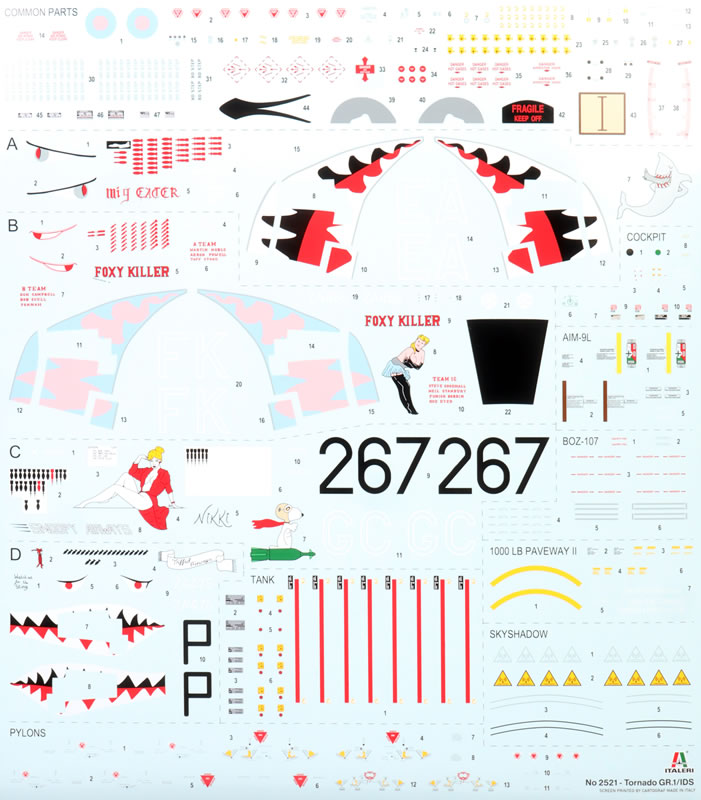 The large and perfectly printed Cartograf decal sheet features four marking options, all from RAF squadrons deployed to the Gulf—"Nikki", “Foxy Killer”, “Triffid Airways”, and “Mig Eater”. Each is complete with distinctive nose art and mission markings.