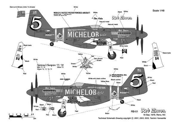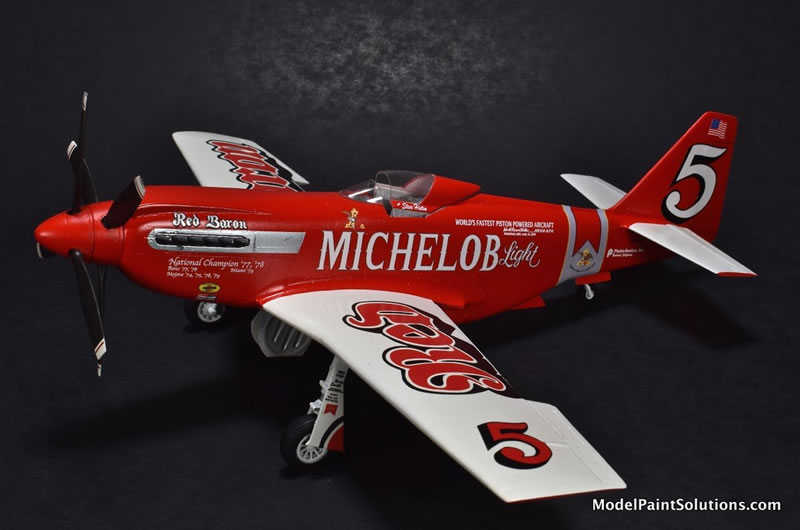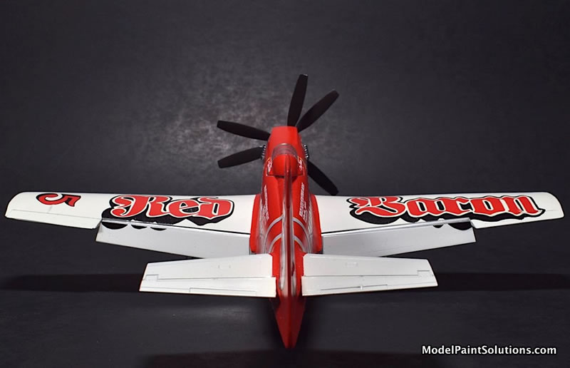 This is a 1:48 model of the Red Baron RB-51 Unlimited Reno Air Racer as it appeared in 1979. The Red Baron was a heavily modified P-51D Mustang that had a Rolls Royce Griffon engine installed driving a set of counter-rotating props.