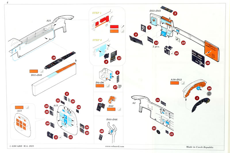 This SPACE set comprises 3D printed decals for the instrument panel and placards, radio faces and boxes, side console, instruments plus convincing half-tone harness straps for the whole crew.