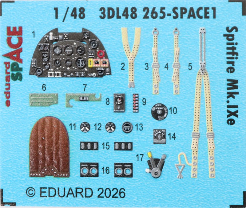 This SPACE set comprises 3D printed decals for the instrument panel and placards, plus photo-etched parts for the half-tone harness straps and throttles.