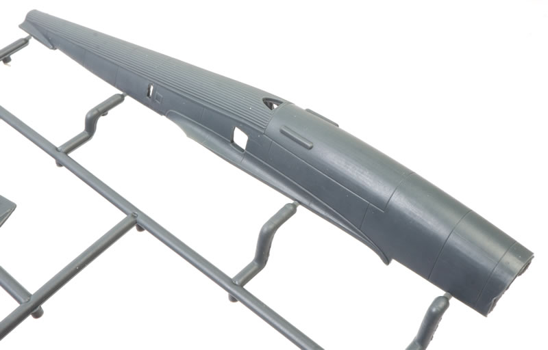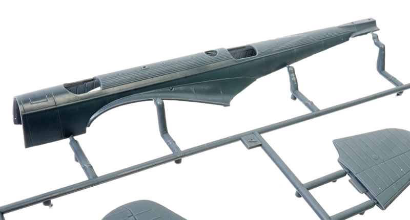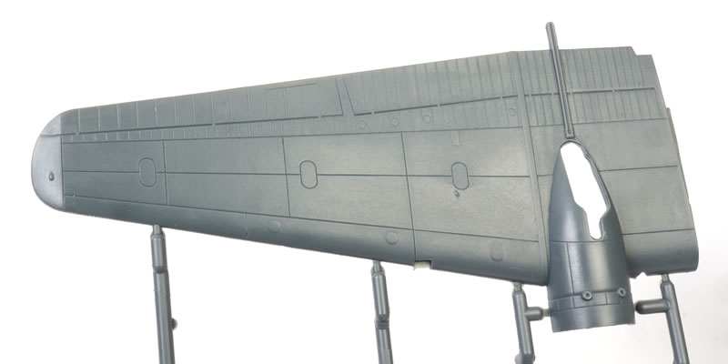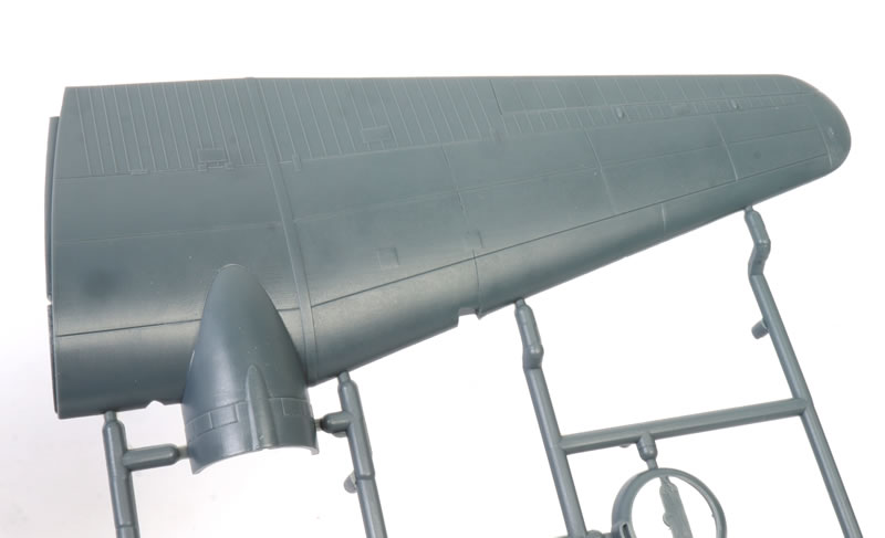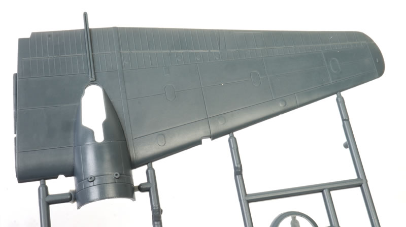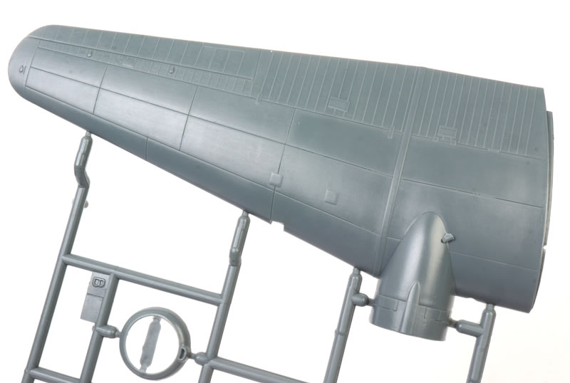 I particularly like the corrugated effect on the top and bottom of the fuselage, and the raised ribs on the flying surfaces. It is interesting that the fuselage halves are split into upper and lower halves. This thoughtful piece of planning means that you won't have to worry about restoring those nice corrugations along upper and lower joins.