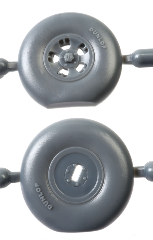 The five-spoke main wheels are provided as two-part assemblies. They are subtly bulged and flattened, with keyed alignment ensuring the flat spot sits correctly on the ground.