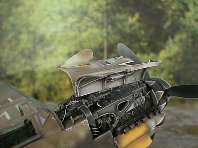 I used the Fujimi 1/48 scale Bf 109G-10 as the basis for this project. Despite not being previously familiar with the Fujimi brand, I was pleasantly surprised with the detail and fit of parts. I also used the FM Detail set, which specifies the use of the Fujimi kit. The FM Detail set includes a DB605D engine and its mounts, cowl guns, replacement cowls, some flap and full cockpit detail in the set. It is made up of mainly resin parts with some etched metal and engine wiring. Instructions are clear and informative. The radio compartment comes from the Verlinden Bf 109 after market super detail set. Kit wheels were replaced with True Detail wheels. Past experience with detailed engine sets has shown that there are usually construction problems. FM Detail did not disappoint me in this respect, although the problem was not major. The bottom cowl is 2mm too short so I had to super glue sheet styrene 2mm thick to one end of the cowl then file and sand to the correct shape. The two engine bearer lower support bars are not supplied, so I scratch built mine from brass tubing. The building and particularly fitting of the bars can be quite challenging. After a lot of work and patience on the engine and installation the end result is very pleasing to the eye.