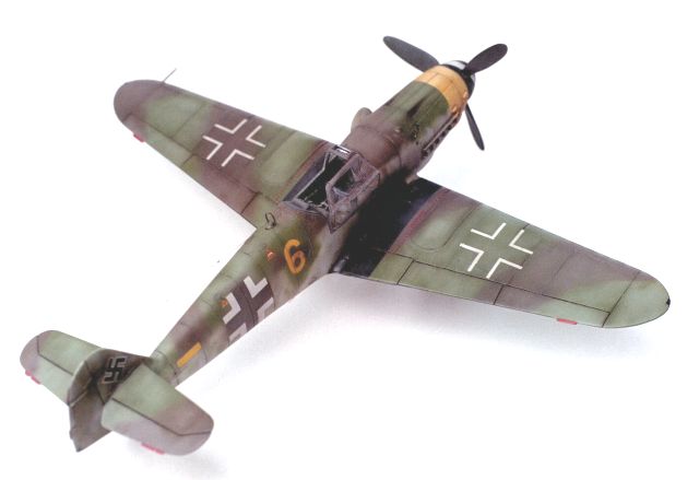 Paints were Modelmaster and Floquil Military Colors oil-based enamels, scale lightened with white and faded through uneven application over the light gray primer. The paint scheme was taken from a profile in Beaman's "Last of the Eagles" and a photo in Hitchcock's "Messerschmitt '09 Gallery" with decals from various sheets in my collection. It is simply identified as a craft of II/JG?, so if anyone knows of any new info since these were published let me know.
