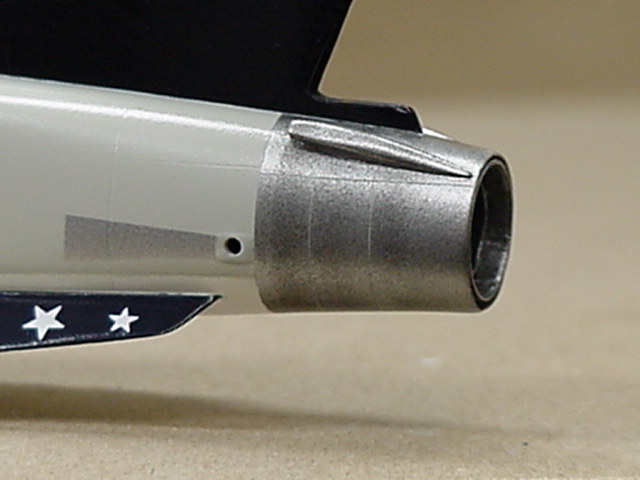 required to achieve a good coverage. The tailpipe area was masked off and sprayed Tamiya Chrome Silver mixed with a little Tamiya White. I used this shade because it was the only silver color available to me at the time. The dark rings around the tail pipe were airbrushed on using a 50/50 mix of Tamiya Chrome Silver and Gunmetal cut 50/50 with isopropyl alcohol. The windshield and the anti glare section were masked off and sprayed Tamiya Flat Black. This color dries to a realistic dark grey shade. After letting the model dry for at least a week, all the painted surfaces were wet sanded using the 8-12000grit cloths. It was then sprayed with two light coats of Gunze Clear Gloss Acrylic mixed 50/50 with isopropyl alcohol. When dry, I again wet sanded the entire model with the 12000 grit cloth in preparation for decal application. (Click