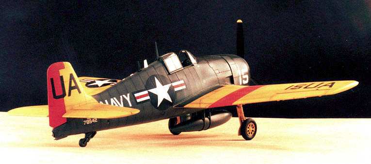 white markings. Although the kit itself is very nice and goes together well, there is one major inaccuracy in this rendition that (as usual!) I didn't find out until after I had finished the model. Although I knew that Drone Hellcats had modified wingtips to take tip-tanks, I had also read that some did not have this modification. My assumption was that Hasegawa had found and depicted one of these un-modified airframes. After I had finished this kit I finally got my hands on the Squadron Signal "In Action" title which had a photo of what appears to be this aircraft and guess what. Yep, it has the modified wing tips. DOH!