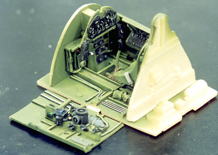 Apart from that, the only real modification was to include a Jaguar cockpit. As you would expect, the detail of this set is beautiful and it fits into the kit very well. The cockpit was given a coat of gloss interior green and as many of the details as possible were also painted in gloss colours (seatbelts etc). An acrylic wash was then applied, followed by matt varnish and dry-brushing with zinc-chromate yellow and various shades of grey as appropriate. Finally, drops of Tamiya gloss varnish were applied to the instruments to simulate glass.