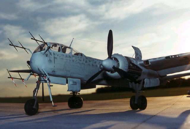 The gear doors had some ejector pin marks but this wasn't a problem. The gear door actuating linkages were added. The tires were airbrushed with combination of Testors Flat Black and Rubber paint and then were dry-brushed by various shades of Gray paint. On my last assembly stages I fitted all the various antennae and external small detailing. I an not a big fan of plastic antennae because they look rather crude and they are a magnet for damage. I therefore installed a new metal D/F loop, and FuG-25A (IFF) aerials. Note that this particular aircraft was not equipped with the FuG16 aerial. Pilot tube and some other small details also were made from metal. The main problem and real headache for me was the FuG 220 SN-2d antennas. I managed to find a line drawings of the FuG220 antenna dipole and soldered five H-shaped elements from fine metal tubes for replacing plastic details. True detentions (diameters) of this element was 26/20/16 mm. I would like to inform all night fighter fans that Russian Model Point firm announced a new product FuG 220 antennas. As in my project, the Model Point antennas are soldered from metal tubes. They look realistic and I hope this product will help modellers finish their projects.