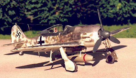 This is a pretty nice little kit, especially for the money (US$6 in mid-1999). There are a few issues with it, though: If you're fairly picky, the nose shape is not quite right. Not much to do about it, and it looks OK to me when built up (still looks like a 190); The landing gear, if assembled per directions, does not have the characteristic Butcher Bird "pigeon-toed" stance. This takes just a little minor surgery; The wing mounting hardware for the glide bomb is inaccurate; The kit's belly rack is probably not entirely correct. It extends aft far enough to cover the underside access panel, which I suspect it should not The pilots head armor is molded as part of the fuselage, which means that the canopy cannot be posed open without modification; The wheel wells apparently represent the bulk of 1/72 190's in that there is a solid wall between the wells and relatively little detail (obviously a production consideration, but it seems to me it would be relatively simple to correct). I really was going to build this OOB (honest!) until I found out about the wheel wells. I looked at several articles on HyperScale, asked a bunch of questions and got a slew of answers from helpful HyperScalers; curiously, detailed pictures of 190A wheel wells are not plentiful, at least in the more common references I have. With the help of a host of HyperScalers I finally understood (I think) what the wells should look like. The difference between the OOB representation and the reality was just too much to bear … I simply had to rework the wheel wells - just the wells - nothing else.