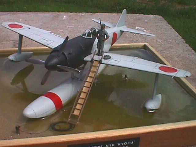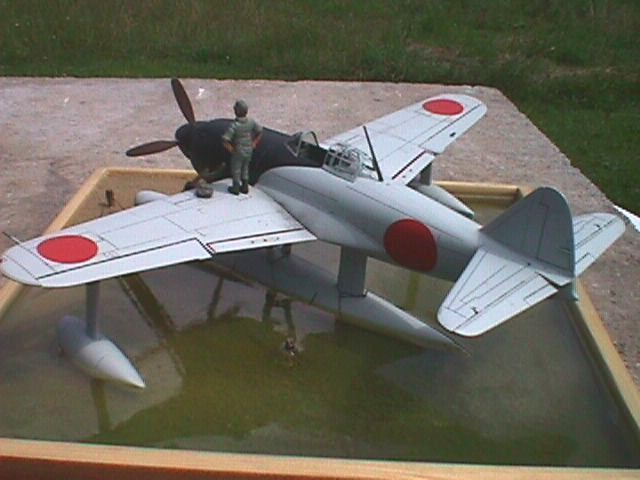 The rest of the conversion consists of a narrower cord fin, narrower main float support, wing armament removal and new aerial mast made from brass strip. The cowl opening was made slightly larger with a large round file, the gun ports were drilled out and tubes set in place. The only other part was the front canopy which need the framing altering by sanding off the original and the new one painted on. The front screen should be more rounded at the front but I omitted this part to laziness (no-one have ever noticed, so I confess all now). Paint was a mix of Humbrol to “Ash Grey” using Ian Bakers excellent Japanese Navy Aircraft colouring guide, the cowl was blue/black (blue added to black (you really didn’t need me to tell you this, did you? )) The kit's Insignia decals were applied with stencilling (no codes were needed) The base was covered in Part One so I won't go into this one. The only difference is a sloped beech edge with the model lightly out of the water. The figure was from a Reheat set of three Japanese pilots.