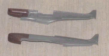 I preferred to work on each half separately rather than after the fuselage was joined. This helped me with alignment. The Mk IX was first cut along the line and very carefully trimmed making sure to keep that kink in the panel line true. This cut was repeated on the Mk V nose and the two offered up. Fit was almost exact. Some light sanding was necessary along the top of the cowl and some filling on the wing fairing but cross sections were almost exact which was a major plus. The nose was secured with liquid poly and reinforced from behind with Zap-A-Gap. When this was done and the two fuselage halves offered together the model already had the unmistakeable air of a Mk V. So far so good! A piece of the Revell lower wing had to be removed and trimmed to fit into the Hasegawa wing recess due to accommodate the small air intake. Again this is merely a careful cutting job. No real problems were encountered and fit was good again with liquid poly and superglue. One advantage of the different colour of the plastic in these two kits is that you can see in the pics exactly what goes where!